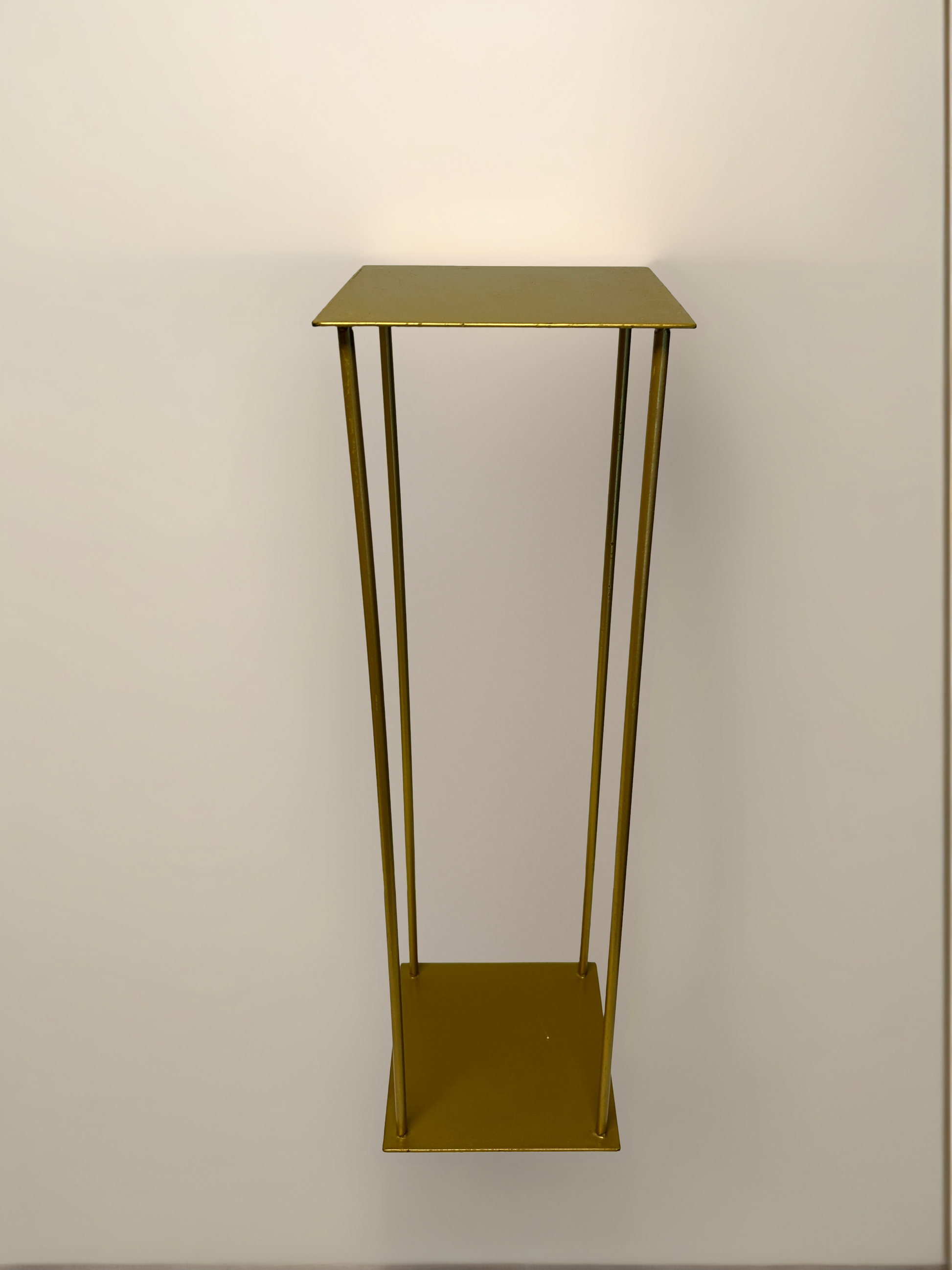 Add a touch of luxury to your event decor with our 24x9.5x9.5" tall gold metallic stand, elegantly crafted with two squares supported by delicate cylindrical rods. Perfect for weddings and special occasions, this stylish stand adds a modern and sophisticated touch to your displays. Available for rentals or purchase, it's ideal for showcasing floral arrangements or creating eye-catching focal points.