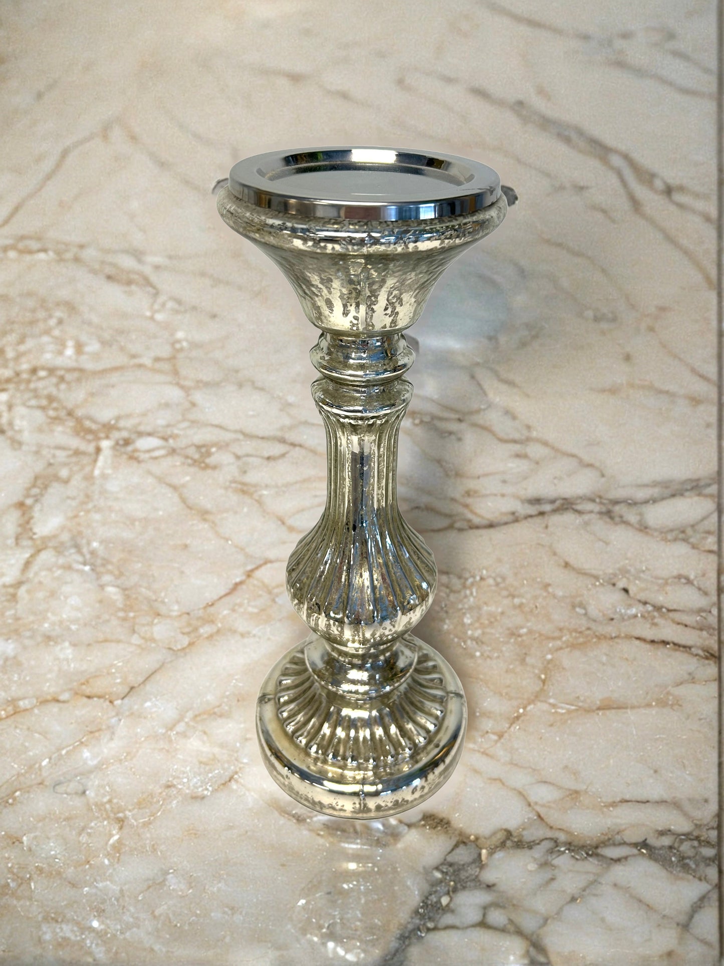 Enhance your event ambiance with our 12.5x3" tall silver-plated glass pillar candle holder. Perfect for weddings, corporate events, and special occasions, this elegant piece is available for rentals or purchase, adding a touch of sophistication to your decor.